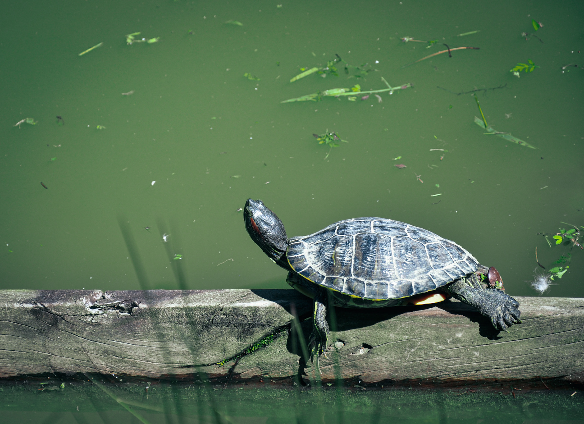 This photo shows a green turtle on a piece of wood, peering upwards through grass. It invites us to appreciate the serene connection between the turtle and its environment, reminding us of the beauty found in nature's harmony.